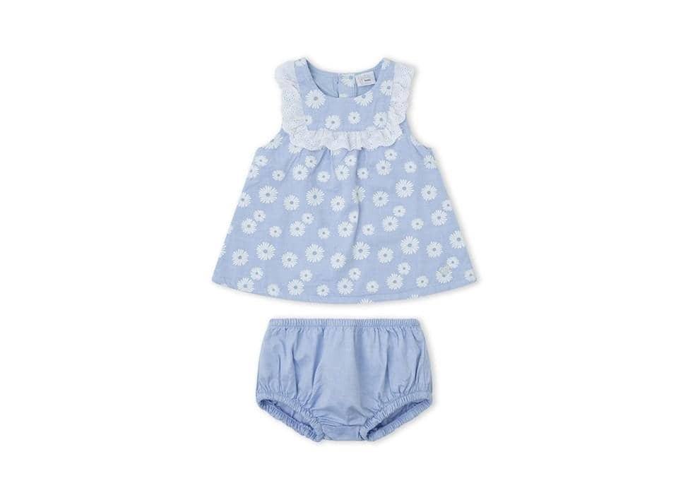 Conjunto de 2 piezas para bebé con vestido de flores en color azul bebé y complemento a juego. Un diseño dulce, cómodo y perfecto para el día a día o ocasiones especiales. Fabricado con tejido suave y transpirable que cuida la piel del bebé.