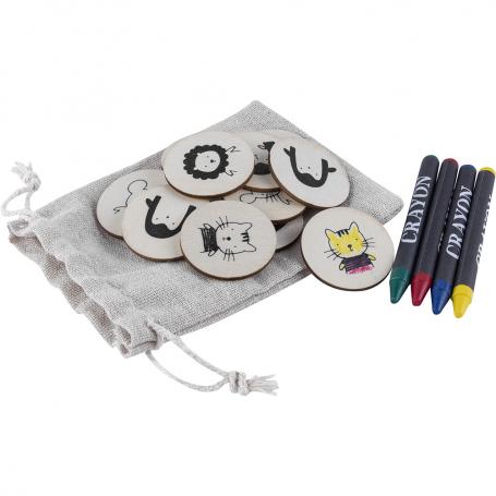 Dentro de la bolsa encontrarás un set de fichas de madera natural y un conjunto de pinturas para decorarlas, permitiendo que los niños puedan personalizar el juego a su gusto antes de empezar a jugar.