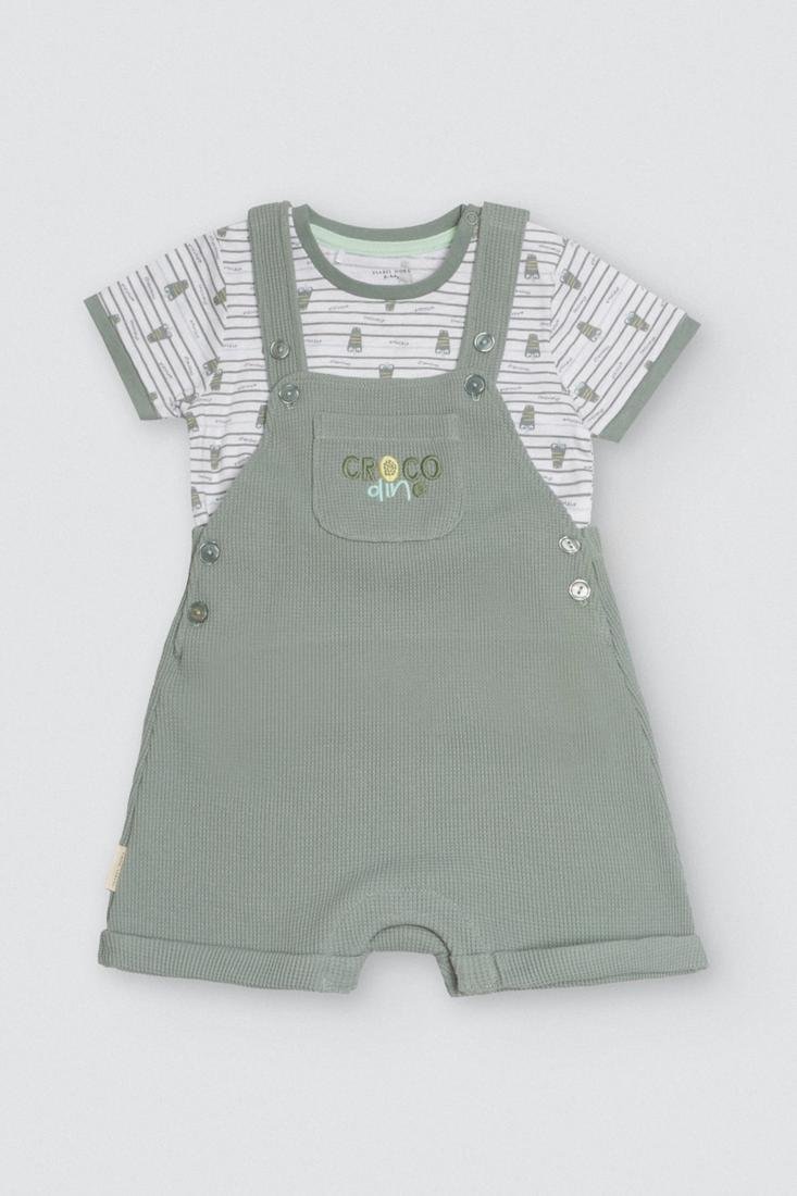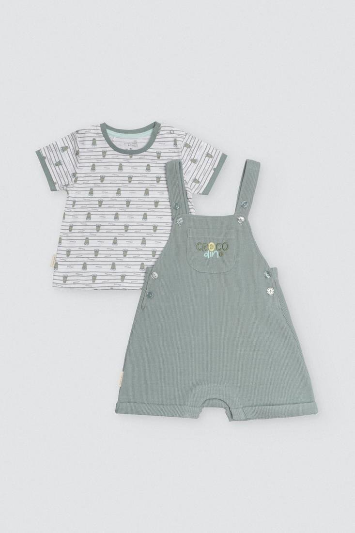 Conjunto de camiseta de manga corta y peto. La camiseta es blanca con rayas y cocodrilos, confeccionada en algodón. El peto tiene un bolsillo con «COCODINO» en la parte delantera, por lo que combina perfectamente con la camiseta. ¡Look perfecto para que los bebés disfruten de la temporada de verano!