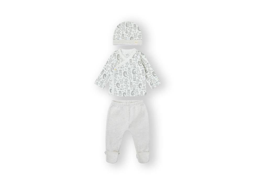 Conjunto para bebé recién nacida de tres piezas, confeccionado en algodón interlok, camiseta con abertura cruzada en delantero, polaina estampada y gorrito.