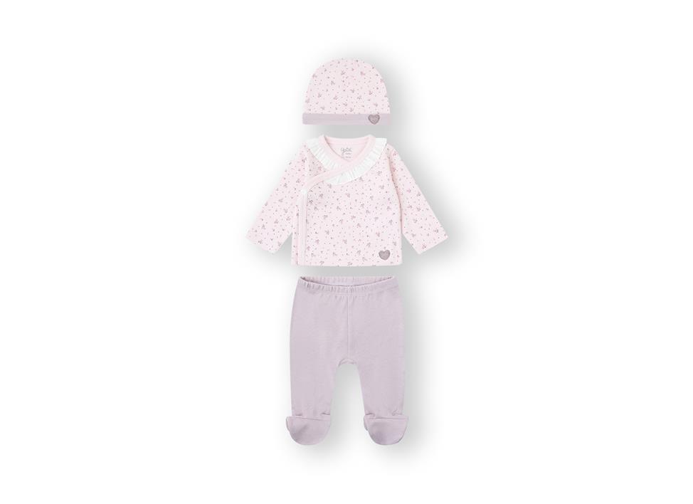 Conjunto para bebé recién nacida de tres piezas, confeccionado en algodón interlok, camiseta con abertura cruzada en delantero, polaina estampada y gorrito.