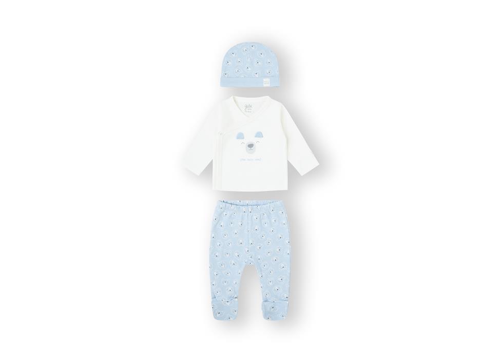 Conjunto para bebé recién nacida de tres piezas, confeccionado en algodón interlok, camiseta con abertura cruzada en delantero, polaina estampada y gorrito.