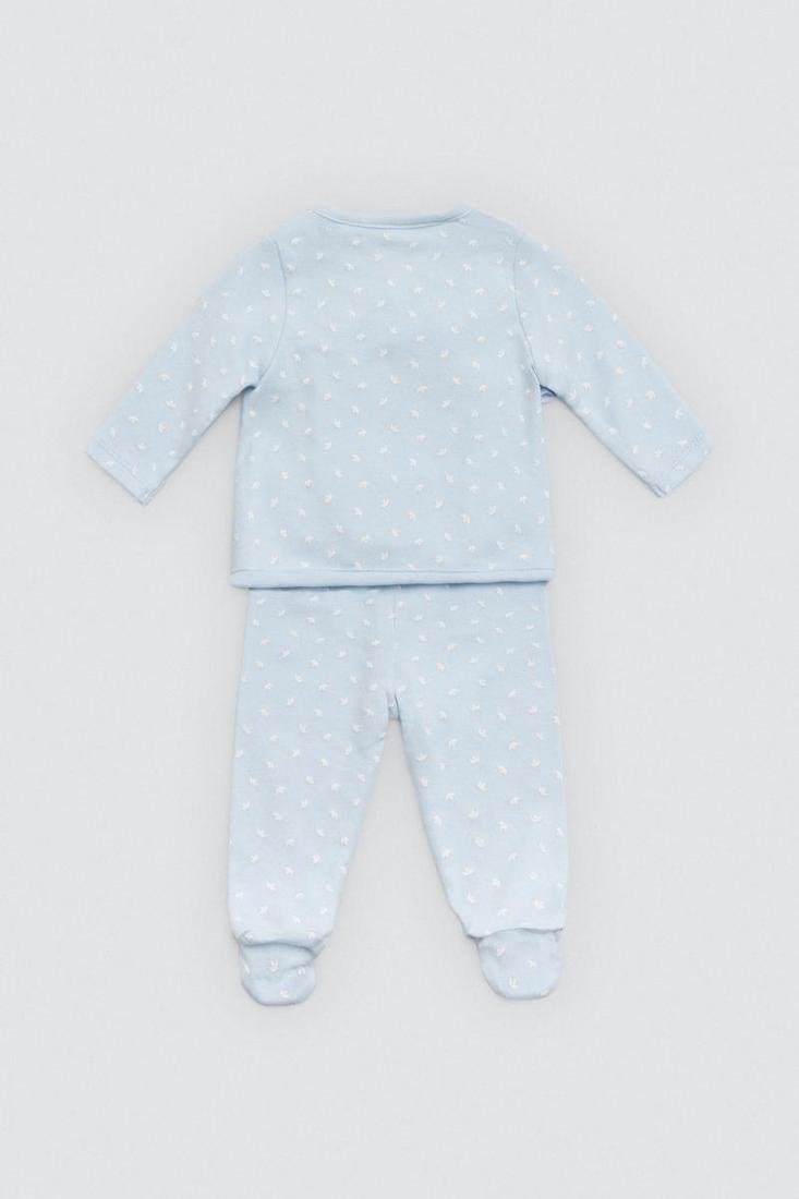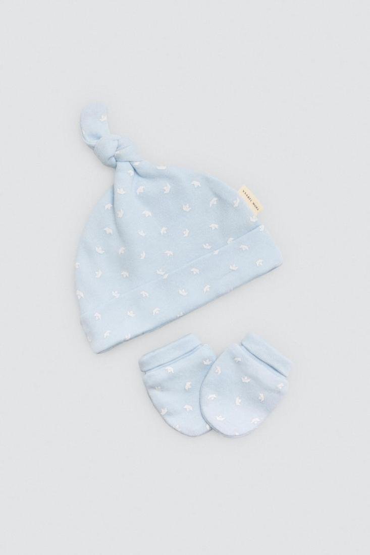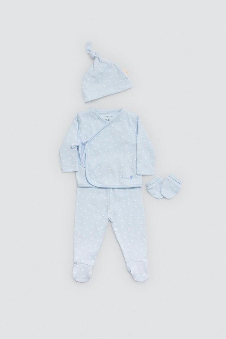 Pack para la primera puesta de bebé niño. Incluye camiseta cruzada, polaina, gorrito con nudo y manoplas.