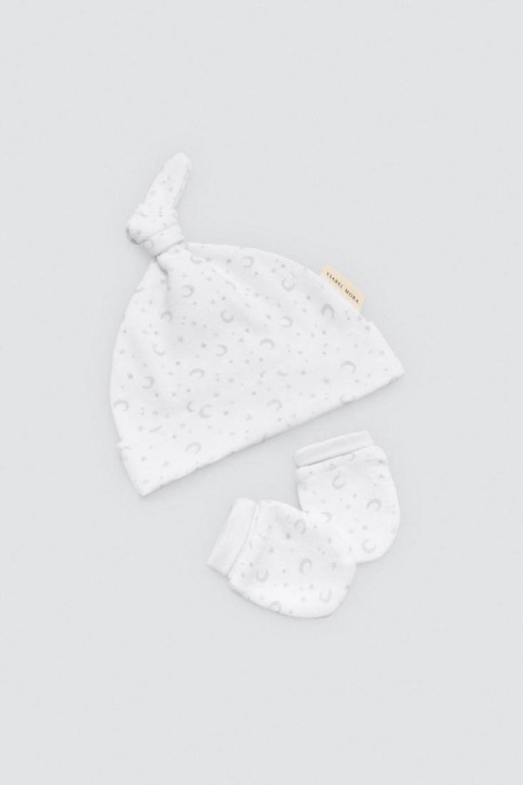Pack unisex para recién nacido con camiseta cruzada de manga larga, polaina, gorro con nudo y manoplas.