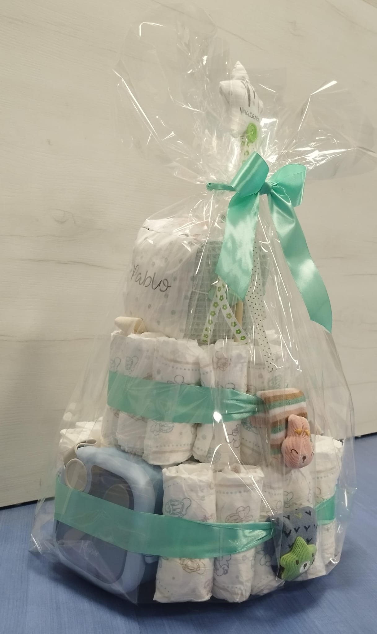 Para un toque más personal, contamos con tartas de pañales personalizadas, donde puedes incluir el nombre del bebé o elegir los productos que más te gusten.