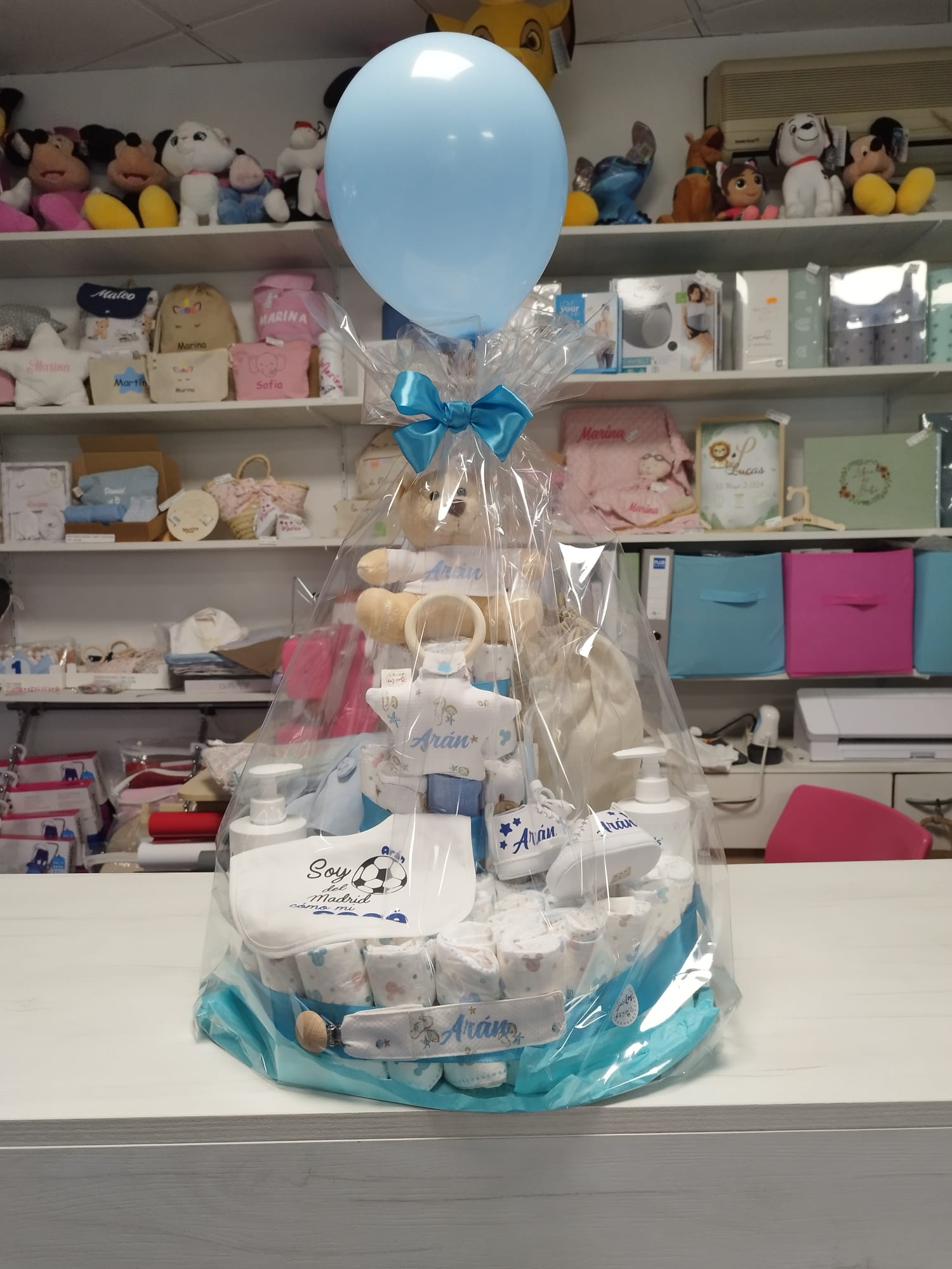 Para un toque más personal, contamos con tartas de pañales personalizadas, donde puedes incluir el nombre del bebé o elegir los productos que más te gusten.